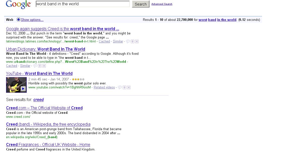 And speaking of service to society. Who, according to the Vox Cyberi, as aggregated by Google algorithms, is the worst band in the world? If you perform the search outright you’ll find this:gg creedA page of results for Creed. An LA Times article from 2008 explains that it’s been like this since at least 2006, and that it’s not some Googly pranksters’ doing. Rather, it is a product of the tangled intermingling of the questions we ask and the answers we provide. We look to the internet to tell us who the worst band in the world is, but we also feed the internet with information about who the worst band in the world is. Therefore, we’re asking Google to tell us that we think the worst band in the world is Creed.