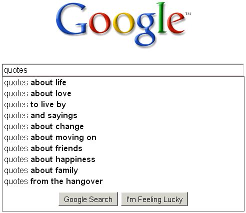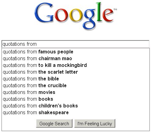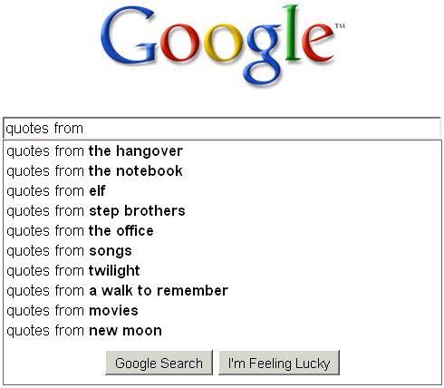 I was amused that among the top searches for “quotes” there appeared two flicks that could hardly provide a more incongruous juxtaposition. I was also a bit taken aback that of all the works people could be searching to cite, two recent (but not the latest, and not the most respected) Hollywood movies vie for the top spot. So I went ahead to see what others were up there by searching “quotes from”: