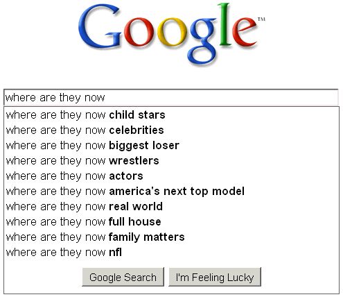 No surprise that reality TV stars and generic celebrity searches top the most popular Where Are They Now queries. But I get a little swelling of pride in my TGIF when I see that Full House and Family Matters are still on the minds of the people.