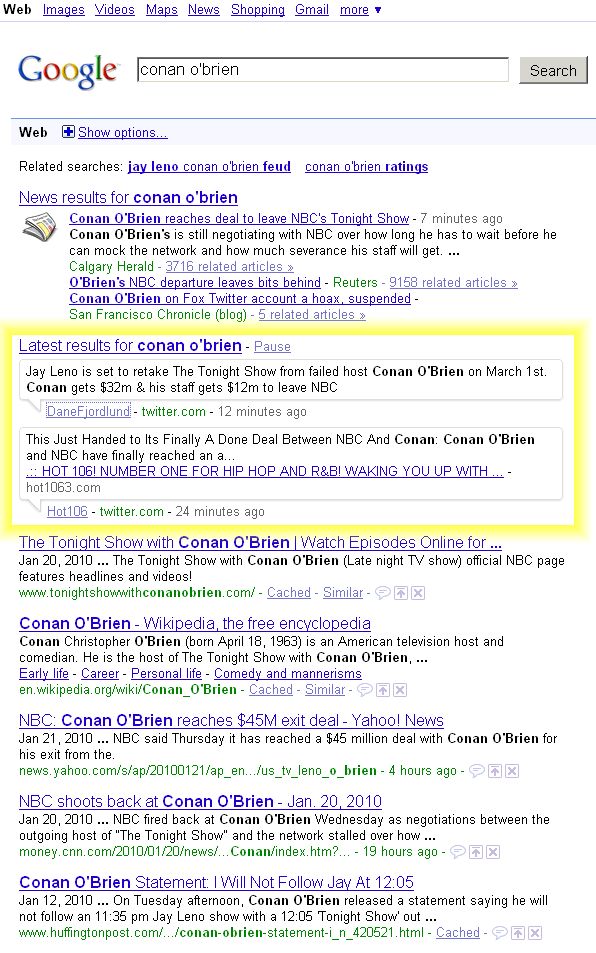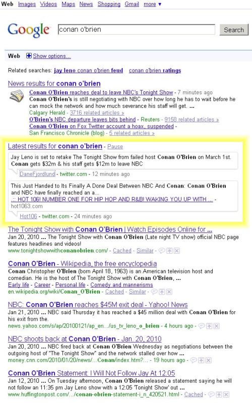 There I am doing an innocent Google search for the latest on the Conan/Jay debacle when I notice results ensconced in freakin’ talk-bubble-boxes (see yellow highlighting):